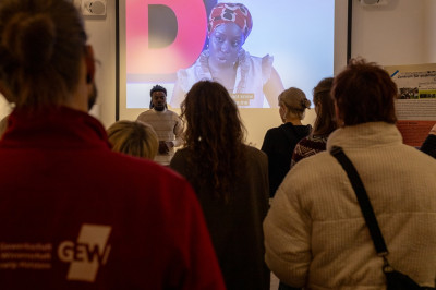 Zum Abschluss der Veranstaltung thematisierte Aktivist, Künstler und Wissenschaftler Steve Nwaogu in seiner Performance wie Wissen und Wissenschaft durch Machtverhältnisse strukturiert werden. Steve Nwaogu ist unter anderem Teil der Silent University – einem Bündnis, das die Arbeit und Position geflüchteter und migrantisierter Wissenschaftler*innen in Hamburg sichtbar macht und stärkt. Er reflektierte im Dialog mit den Gäst*innen, was es bedeutet, Wissen zu produzieren, wenn die Mehrheitsgesellschaft und staatliche Institutionen den Wert des eigenen Wissens absprechen und welche Räume und solidarischen Netzwerke nötig sind, um ein machtkritisches „Wissen aller“ auf- und auszubauen.